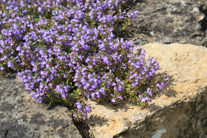 Душевка альпийская, Щебрушка альпийская, Горный тимьян - Acinos alpinus Синонимы: Calamintha alpina (L)., Thymus alpinus (L)., и Satureja alpina (L).. Многолотнее травянистое вечнозеленое растение семейства Lamiaceae. Есть две разновидности: A. alpinus meriodionalis с более мелкими по размеру цветами; и A. alpinus majoranifolius с меньшим количеством цветков в соцветии. Растение происходит из гор южной и центральной Европы, где растет на высоте от 900 до 2600 метров выше уровня моря на открытых местах, горных трещинах, и местах с небольшим количеством плодородной почвы. Стебель древеснеющий, опушенный. Листья парные, от яйцевидной до ланцетной формы от 5 до 15 мм длиной. Цветы фиолетовые, с белыми штрихами на нижней губе, 15-20 мм длиной, собраны в соцветия по 3-8 шт. Цветет с конца мая по июль. Выращивают в альнинариях и контейнерах на сухих, солнечных местах с песчаной, хорошо дренированной почвой, богатой кальцием. Влажных почв и зимней сырости не любят. Размножают посевом семян, в благоприятных условиях возможен самосев. Высевают семена весной, всходы появляются в течение месяца при температуре 16-21 град. Можно размножать черенкованием в начале лета и делением куста весной. В саду, как правило, ведут себя как малолетники. Зона выращивания по западным каталогам 4-9. |