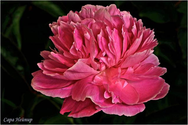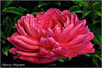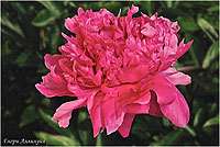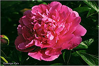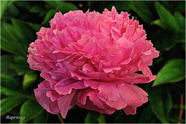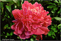 Варенька - Varenka. (Краснова, 1957, СССР). Молочноцветковый. Махровый розовидный - шаровидный. Тёмно - розовый блестящий. Диаметр цветка - 18 см. Высота куста - 80 см. Запах слабый. Средний срок цветения. |