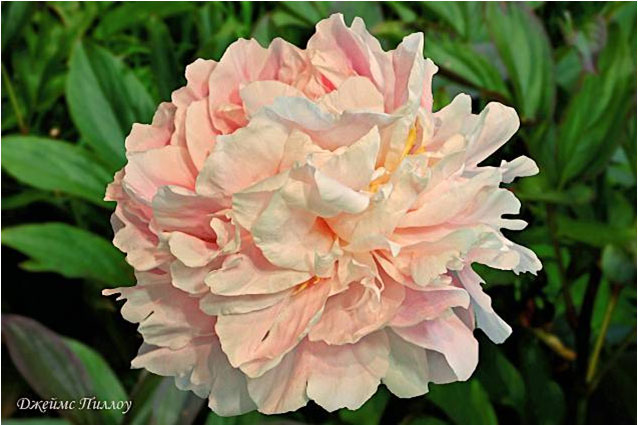 Джеймс Пиллоу - James Pillow. (Пиллоу, 1936, США). Молочноцветковый. Махровый розовидный. Розовый с жёлтым отблеском у основания лепестков. Диаметр цветка - 18 см. Высота куста - 100 см. Запах приятный. Средне - поздний срок цветения. |