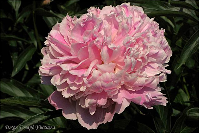 Джон Говард Уиджелл – John Howard Wiegell. (Уиджелл, 1942, США). Молочноцветковый. Махровый розовидный. Розовый, возможны кремовые петалодии. Диаметр цветка - см. Высота куста - 60 см. Запах слабый. Средний срок цветения. |