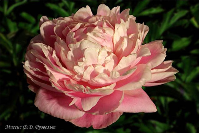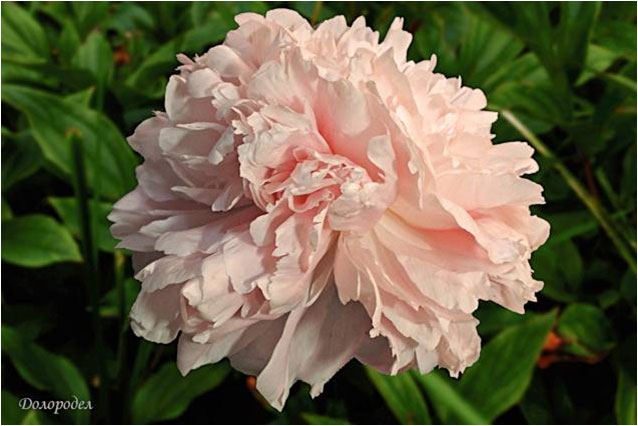 Долородел - Doloradel. (Линс, 1941, США). Молочноцветковый. Махровый розовидный. Светло - розовый. Диаметр цветка - 18 см. Высота куста - 90 см. Запах слабый. Средний срок цветения. |