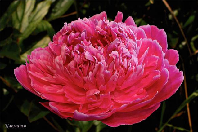Клемансо - Clemenseau. (Дессер, 1920, Франция). Молочноцветковый. Махровый шаровидный. Тёмно - розово -сиреневый. Диаметр цветка - 20 см. Высота куста - 90 см. Запах приятный. Средний срок цветения. |