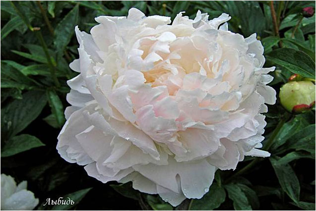 Лыбидь - Lybed. (Харченко - Горобец - Тыран, 1989, СССР). Молочноцветковый. Махровый розовидный. Светло - розовый. Диаметр цветка - 18 см. Высота куста - 70 см. Запах слабый. Поздний срок цветения. |