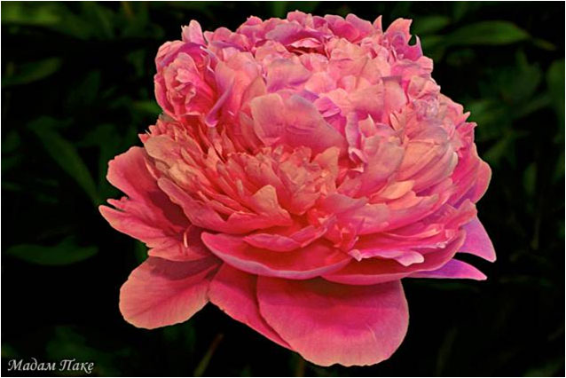 Мадам Паке - M - me Paguez. (?, ?, ?). Молочноцветковый. Махровый полушаровидный. Розовый. Диаметр цветка - см. Высота куста - 80 см. Запах слабый. Поздний срок цветения. |
