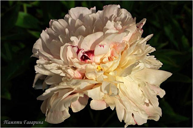 Памяти Гагарина - Pamyati Gagarina. (Краснова, 1957, СССР). Молочноцветковый. Махровый розовидный. Светло - розовый с насыщением к центру. Диаметр цветка - 18 см. Высота куста - 80 см. Запах приятный. Средний срок цветения. |