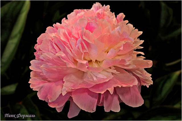 Пинк Формаль - Pink Formal. (Никольс, 1953, США). Молочноцветковый. Махровый полушаровидный. Розовый с лиловым оттенком. Диаметр цветка - 20 см. Высота куста - 70 см. Запах приятный. Средне - поздний срок цветения. |