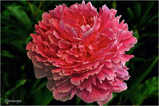 Премьера - Premiera. (Виноградов, 1971, СССР). Молочноцветковый. Махровый розовидный. Тёмно - розовый. Диаметр цветка - 16 см. Высота куста - 90 см. Запах слабый. Средне - поздний срок цветения. |
