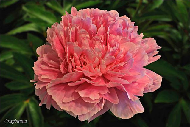 Скарбныца - Skarbnitsya. (Горобец, 1994, Украина). Молочноцветковый. Махровый розовидный. Розовый. Диаметр цветка - 16 см. Высота куста - 80 см. Запах приятный. Средний срок цветения. |