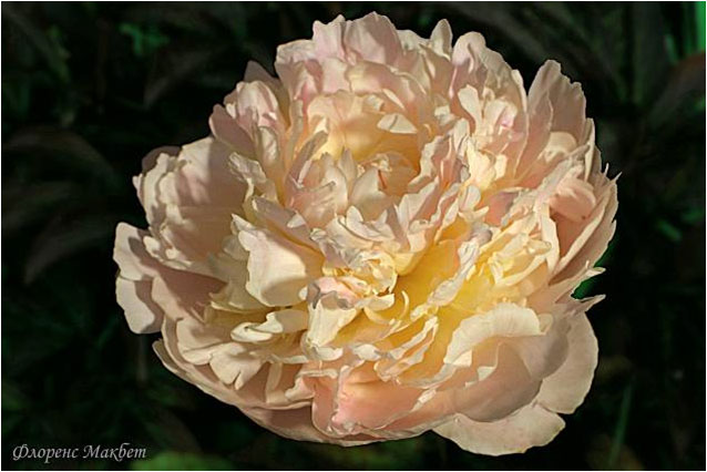 Флоренс Макбет - Florence Macbeth. (Сасс, 1924, США). Молочноцветковый. Махровый. Цвета бледно - розовой раковины с жёлтым подсветом из глубины. Диаметр цветка - 18 см. Высота куста - см. Запах слабый. Средне - поздний срок цветения. |