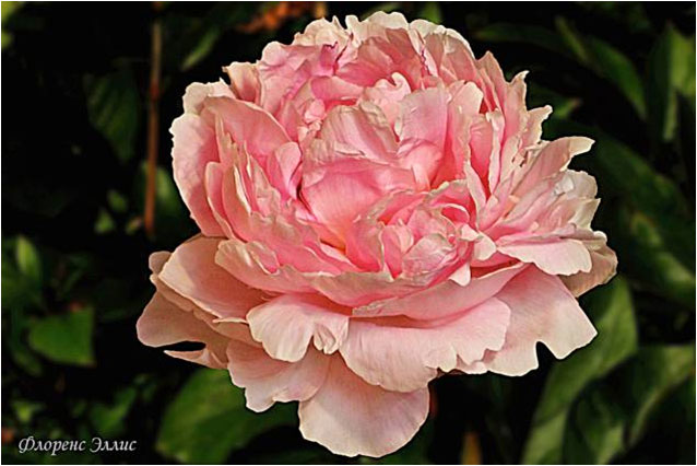 Флоренс Эллис - Florens Ellis. (Никольс, 1948, США). Молочноцветковый. Махровый розовидный. Светло - розовый. Диаметр цветка - 17 см. Высота куста - 100 см. Запах отсутствует. Средний срок цветения. |
