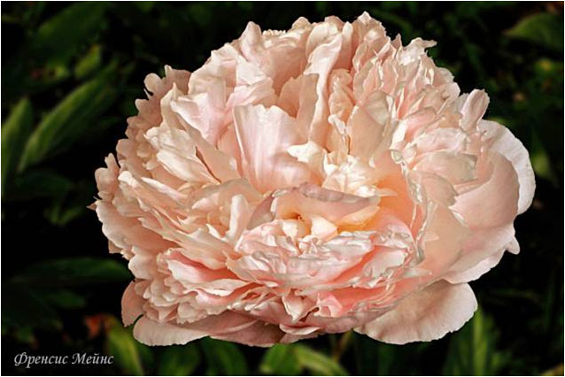 Фрэнсис Мейнс - Frances Mains. (Мейнс, 1955, США). Молочноцветковый. Махровый розовидный. Светло - розовый. Диаметр цветка - 20 см. Высота куста - 90 см. Запах слабый. Поздний срок цветения. |