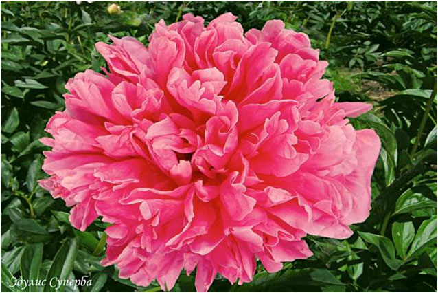 Эдулис Суперба - Edulis Superba. (Лемон, 1824, Франция). Молочноцветковый. Махровый корончатый. Темно - розово - сиреневый. Диаметр цветка - 14 см. Высота куста - 90 см. Запах приятный сильный. Ранний срок цветения. |