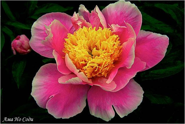 Ама Но Соди - Ama No Sode. (?, До 1928, Япония). Молочноцветковый. Японской формы. Ярко - розовый, центр жёлтый, подкрашенный розовым. Диаметр цветка - 15 см. Высота куста - 80 см. Запах неприятный. Средний срок цветения. |