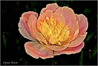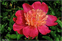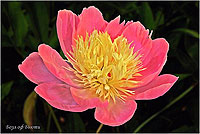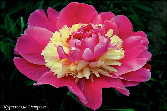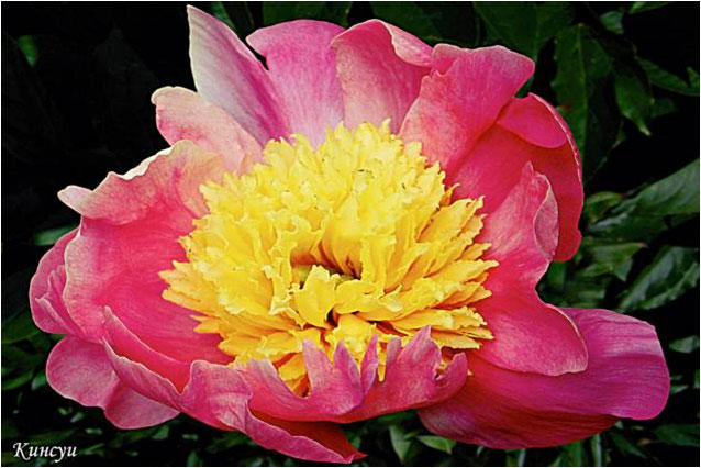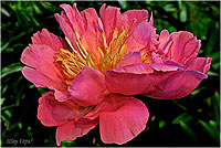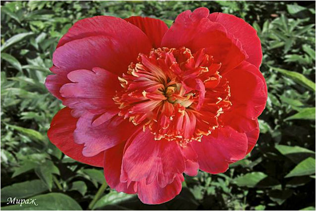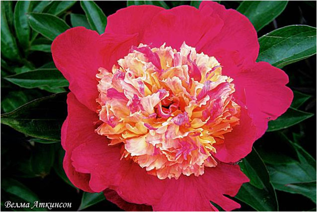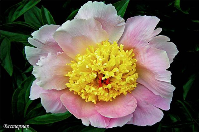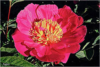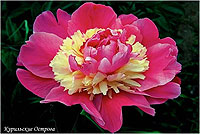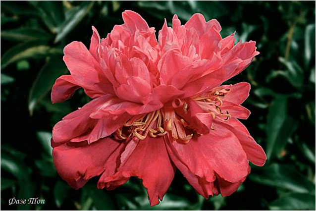 Фазе Топ - Feather Top. (Уайльд, 1970, США). Молочноцветковый. Японской формы - махровый. 6 - 7 рядов из ярко - розовых лепестков, затем лента жёлтых стаминодий, центр розовый. Диаметр цветка - 15 см. Высота куста - 80 см. Запах слабый. Средний срок цветения. |