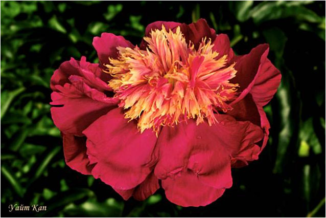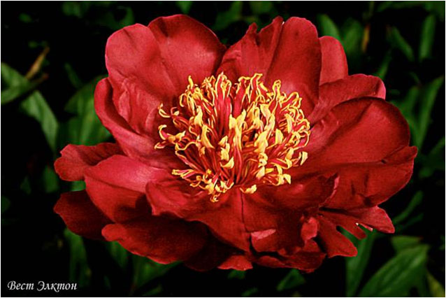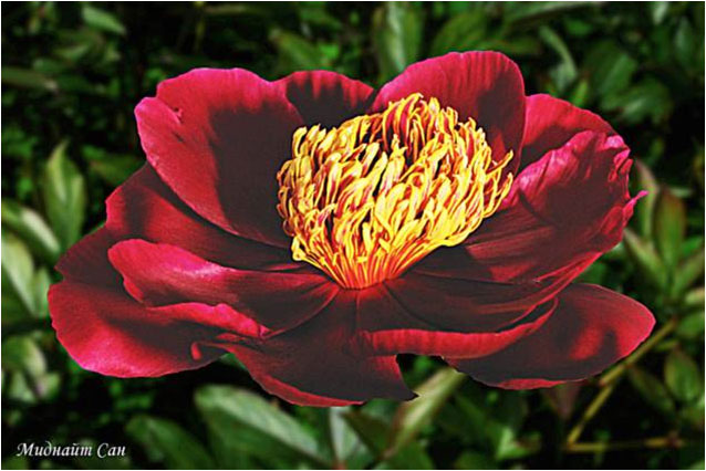 Миднайт Сан - Midnight Sun. (Муравска, 1954, США). Молочноцветковый. Японской формы. Тёмно - красный, стаминодии с золотым краем. Диаметр цветка - см. Высота куста - см. Запах слабый. Средний срок цветения. |