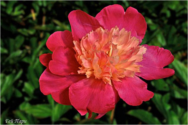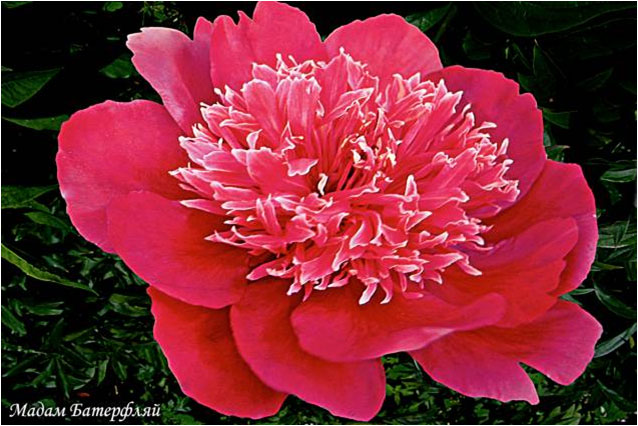 Гей Пари - Gаy Paree. (Отен, 1933, США). Молочноцветковый. Японской формы, близок к анемоновидному. Тёмно - розово - красный, стаминодии - петалодии кремовые. Диаметр цветка - 15 см. Высота куста - 100 см. Запах слабый. Средне - поздний срок цветения. |