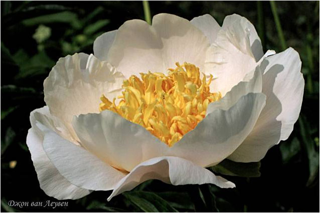 Джон ван Леувен - John van Leeuven. (Джон Леувен, 1928, Голландия). Молочноцветковый. Японской формы. Чисто - белый, стаминодии жёлтые. Диаметр цветка - 17 см. Высота куста - 80 см. Запах приятный. Средне - поздний срок цветения. |
