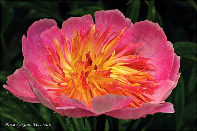 Жемчужная Россыпь - Zhemchuzhnaya Rossyp. (Горобец - Тыран, 1989, СССР). Молочноцветковый. Японской формы. Розово - перламутровый, стаминодии жёлто - розовые. Диаметр цветка - 16 см. Высота куста - 80 см. Запах приятный. Средний срок цветения. |