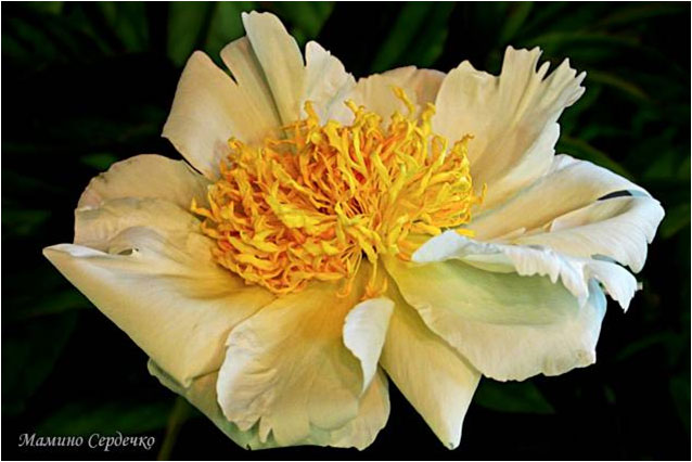 Курильские Острова – Kurilskie Ostrova. (Дубров, 1994, Россия). Молочноцветковый. Японской формы. Кремовый, стаминодии жёлтые. Диаметр цветка - 18 см. Высота куста - 100 см. Запах слабый. Средне - поздний срок цветения. |