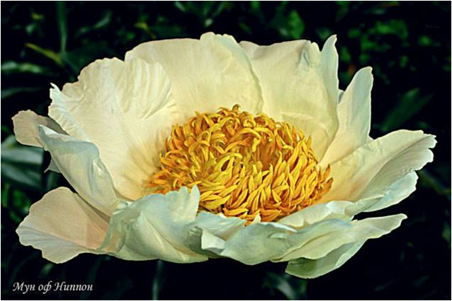 Мун оф Ниппон - Moon of Nippon. (Отен, 1936, США). Молочноцветковый. Японской формы. Белый с зеленоватым оттенком, стаминодии жёлтые. Диаметр цветка - 17 см. Высота куста - 100 см. Запах приятный. Средне - поздний срок цветения. |