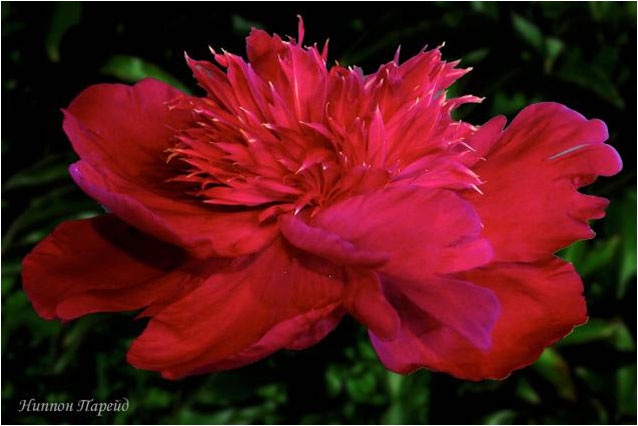 Ниппон Парейд - Nippon Parade. (Отен, 1935, США). Молочноцветковый. Японской формы. Яркий светло - красный, центр отсвечивает светлее. Диаметр цветка - 13 см. Высота куста - 80 см. Запах неопределённый. Средний срок цветения. |