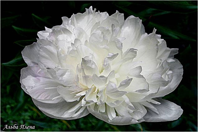 Альба Плена - Alba plena. (, , ). Видовой. Махровый полушаровидный. Белый. Диаметр цветка - 14 см. Высота куста - 60 см. Запах слабый. Очень ранний срок цветения. |